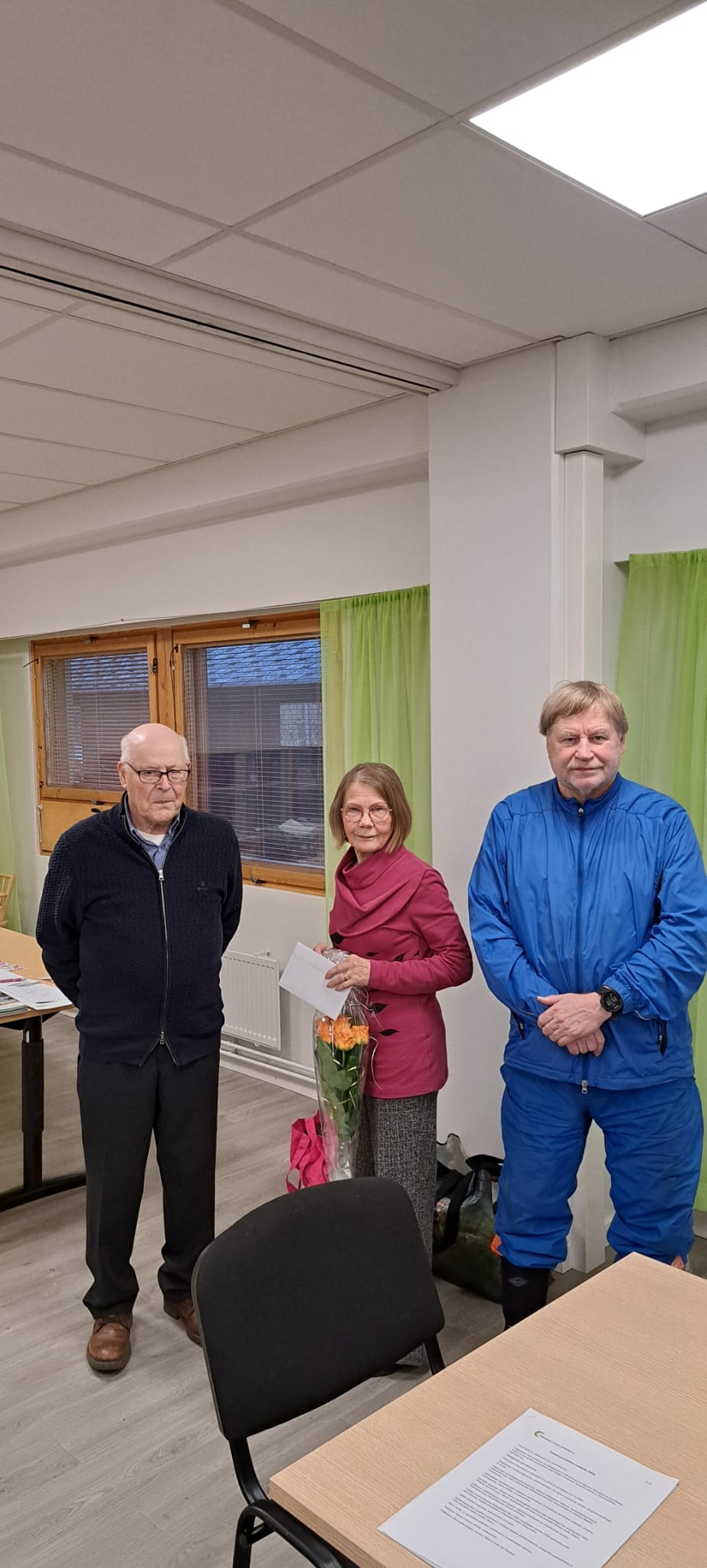 6 vuotta yhdistyksen puheenjohtajana työskennellyt Maija Kyllönen sai kiitoskukat Urjalan ÄijäVirtaa-ryhmältä, kuvassa vas. Seppo Martti, puheenjohtaja Maija Kyllönen ja Unto Murto.